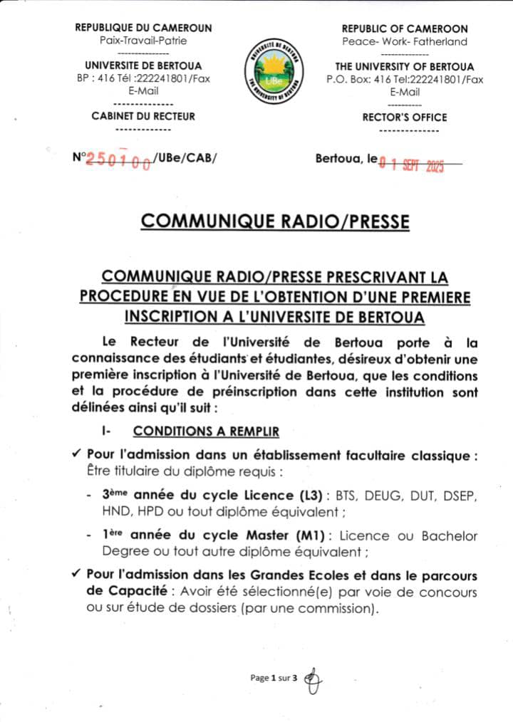 PROCÉDURE EN VUE DE L'OBTENTION D'UNE PREMIÈRE INSCRIPTION À L'UNIVERSITÉ DE BERTOUA.